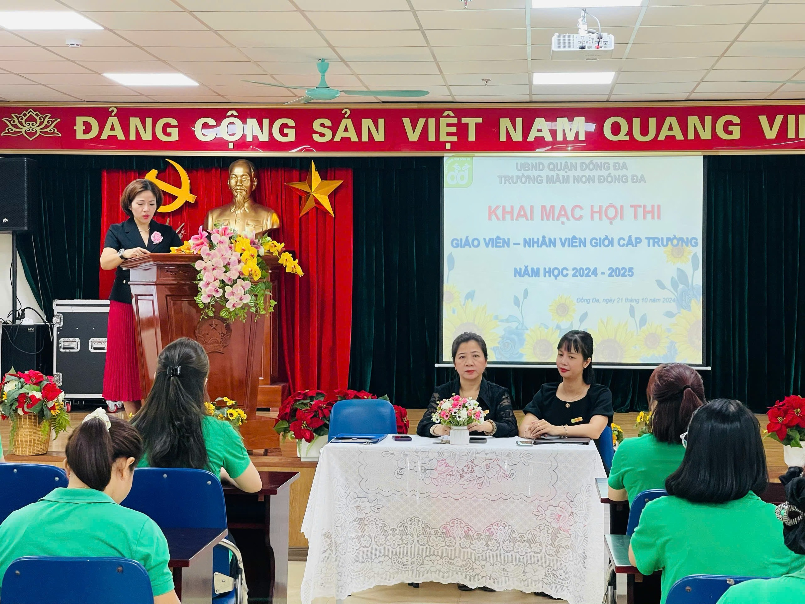 Sáng nay ngày 21/10/2024 Trường Mầm non Đống Đa đã tổ chức khai mạc Hội thi giáo viên, nhân viên giỏi cấp trường với mục đích nhằm phát hiện, công nhận và tôn vinh giáo viên đạt danh hiệu giáo viên dạy giỏi, nhân viên nuôi dưỡng giỏi để tạo điều kiện cho GV-NV thể hiện năng lực của mình, học tập trao đổi kinh nghiệm về giảng dạy, nuôi dưỡng chăm sóc trẻ và tổ chức lớp học; Khai thác, sử dụng sáng tạo hiệu quả phương tiện, đồ dùng dạy học, đồ chơi trẻ em; chế biến món ăn đảm bảo định lượng và chất dinh dưỡng...